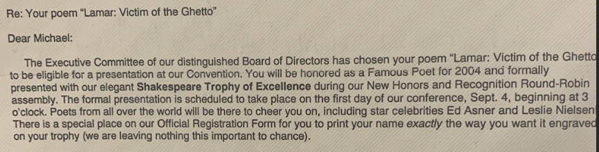 Shakespeare Trophy of Excellence Winner (National - USA), National Poetry Competition