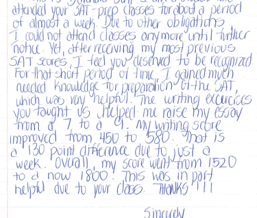 From 2002-06, Michael Tofte Jr. established one of the most successful SAT prep programs in the world with students averaging over a 300 point score increase per student. Below you will find a student testimonial and sample score report (posted with permission; however, I still redacted the name and address of the individual).
